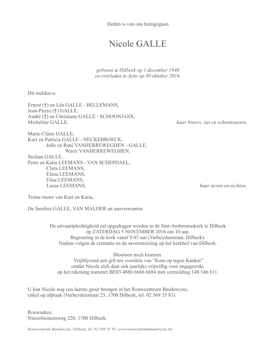 Décédée à Jette (1090) le dimanche 30 octobre 2016 à l'âge de 75 ans