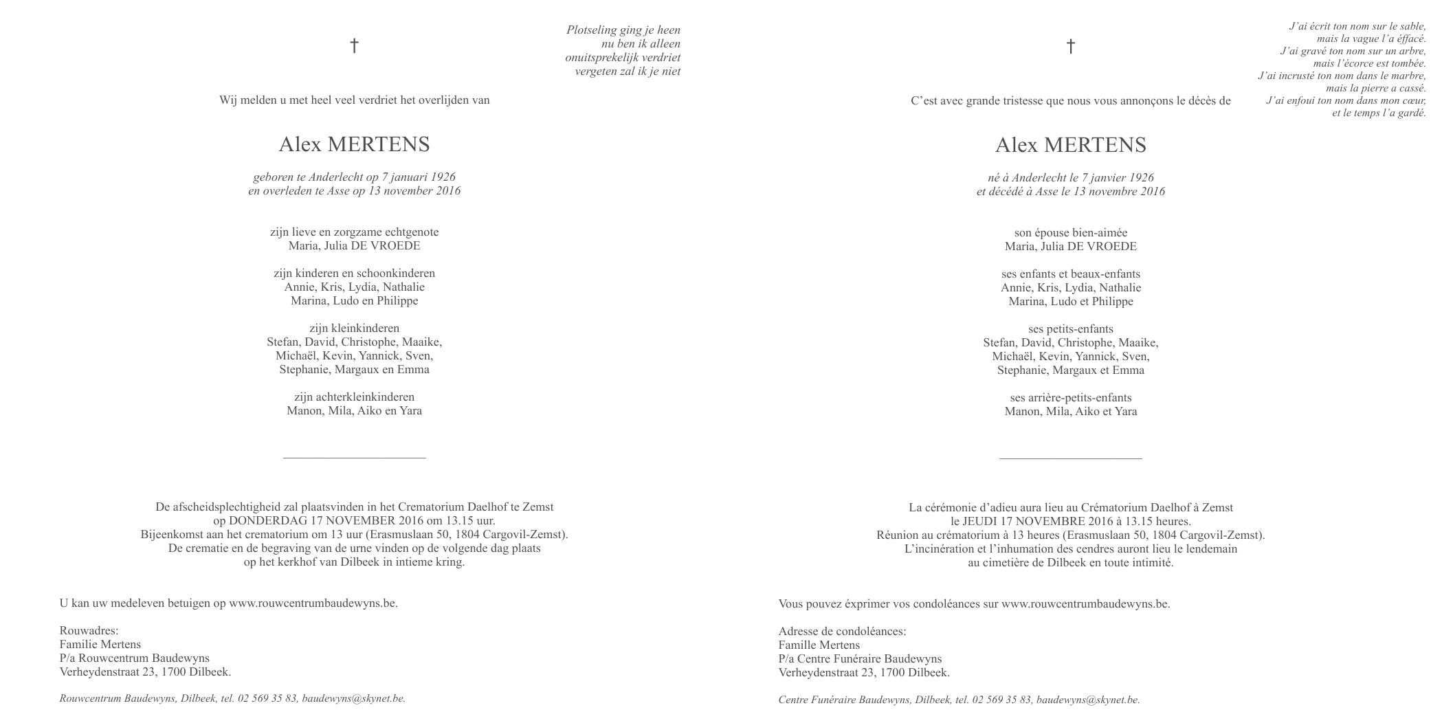 Décédé à Asse (1730) le dimanche 13 novembre 2016 à l'âge de 90 ans