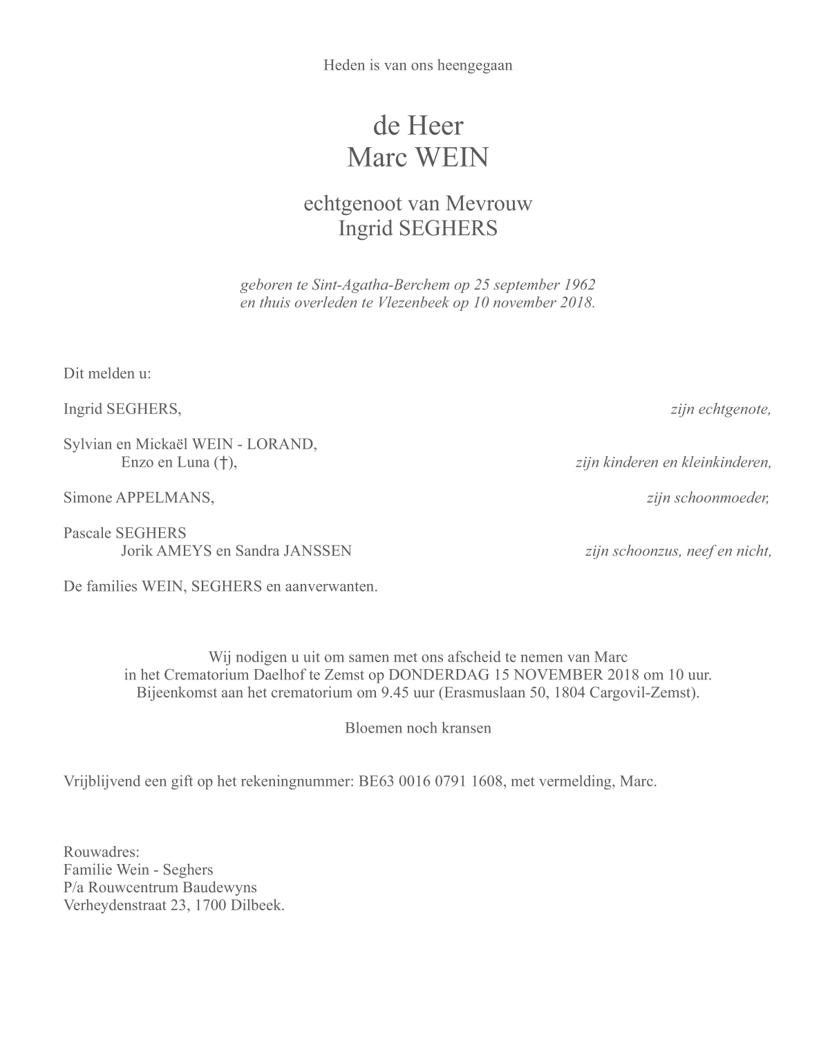 Décédé à Vlezenbeek (1602) le samedi 10 novembre 2018 à l'âge de 56 ans