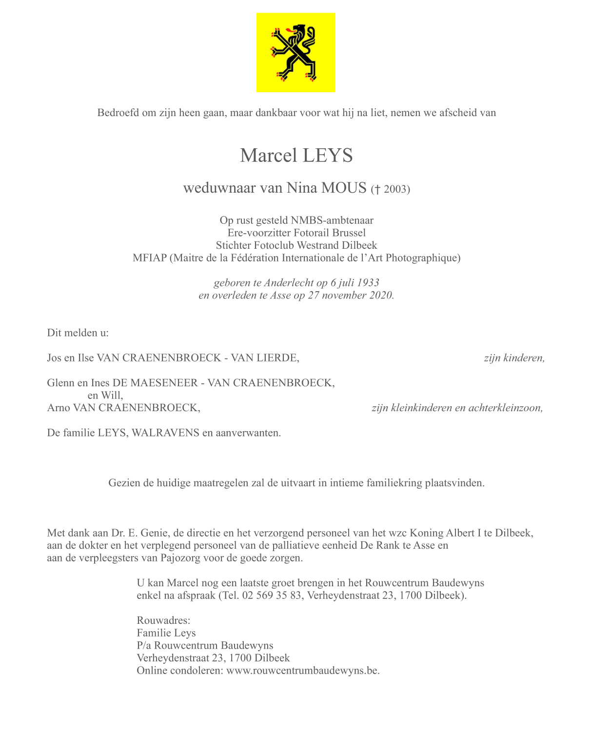 Décédé à Asse (1730) le vendredi 27 novembre 2020 à l'âge de 87 ans