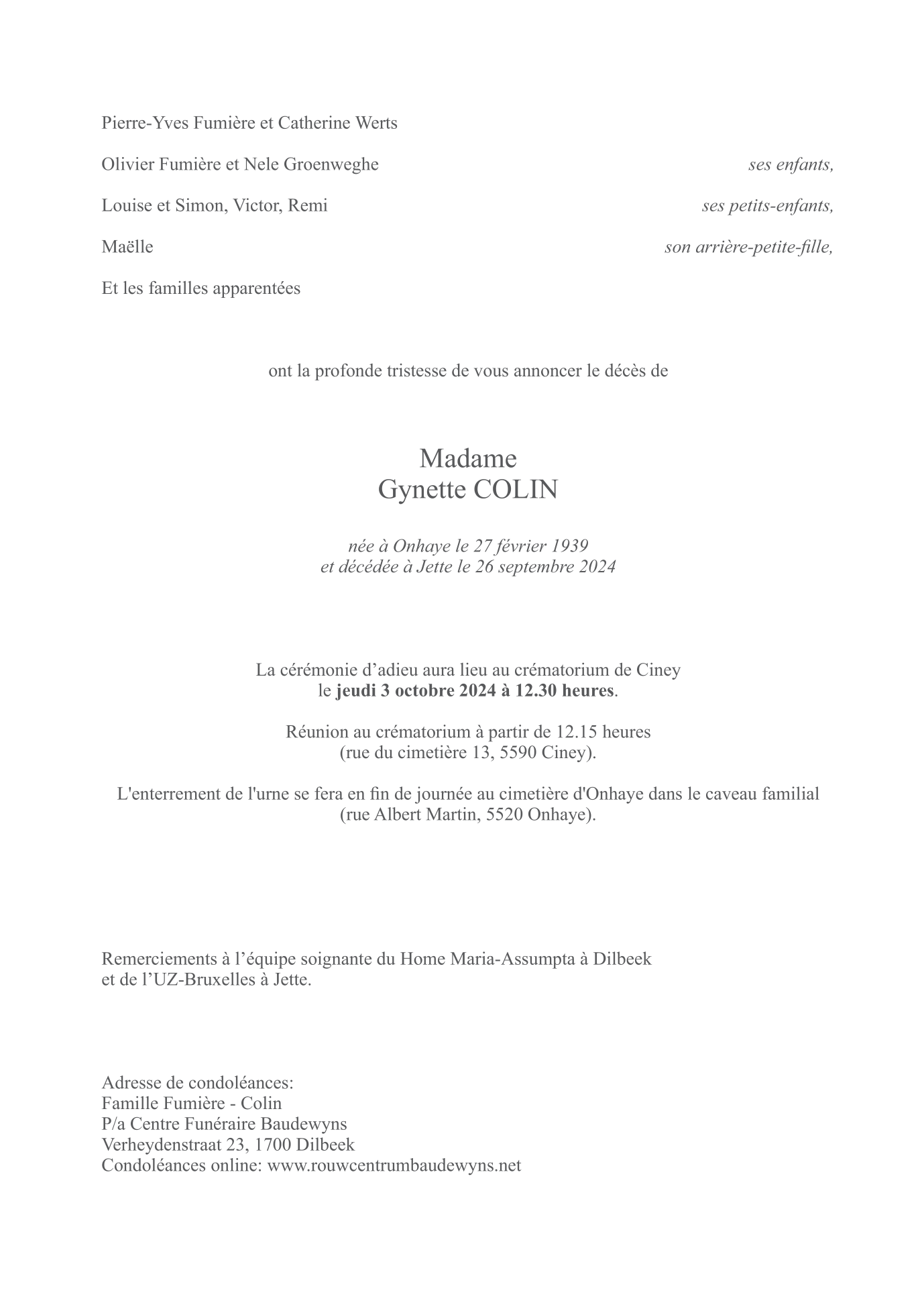 Décédée à Jette (1090) le jeudi 26 septembre 2024 à l'âge de 85 ans
