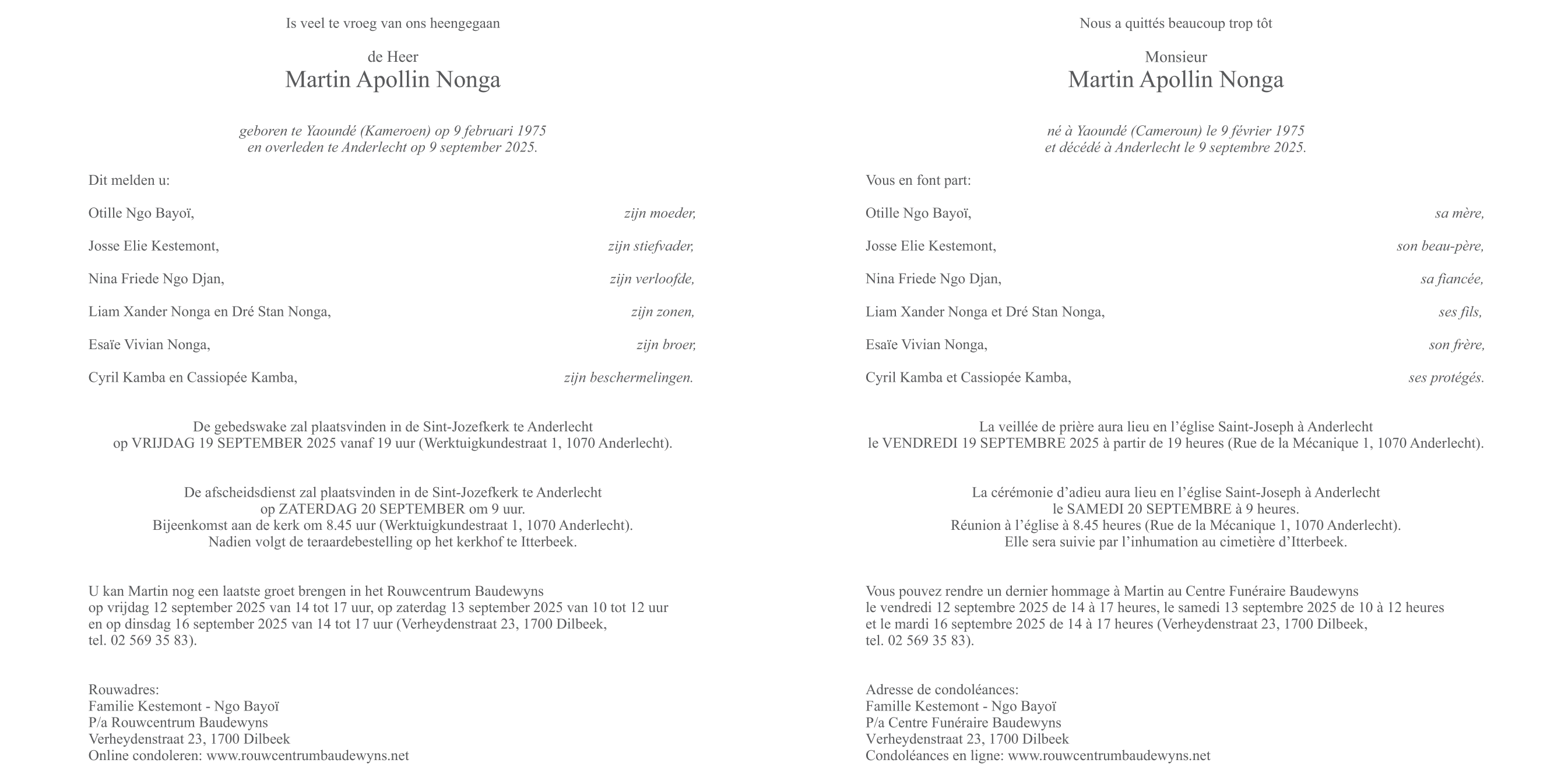 Décédé à Anderlecht (1070) le mardi 9 septembre 2025 à l'âge de 50 ans