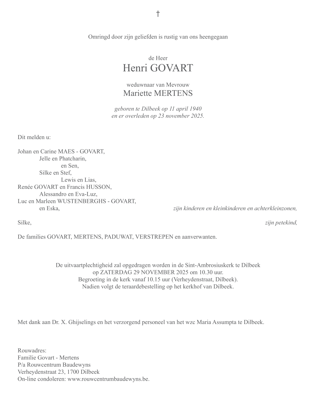 Décédé à Dilbeek (1700) le dimanche 23 novembre 2025 à l'âge de 85 ans