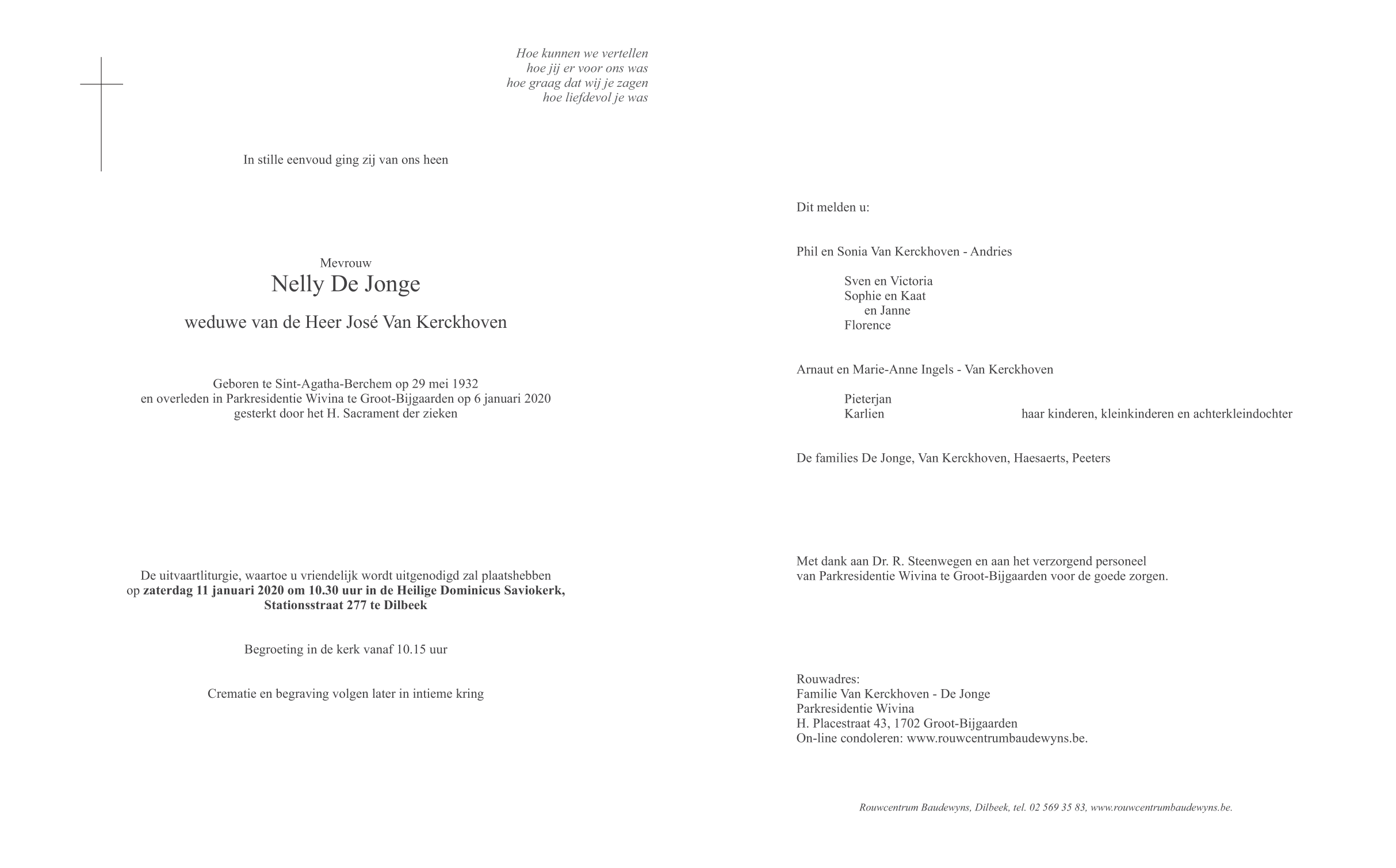 Décédée à Groot-Bijgaarden (1702) le lundi 6 janvier 2020 à l'âge de 87 ans