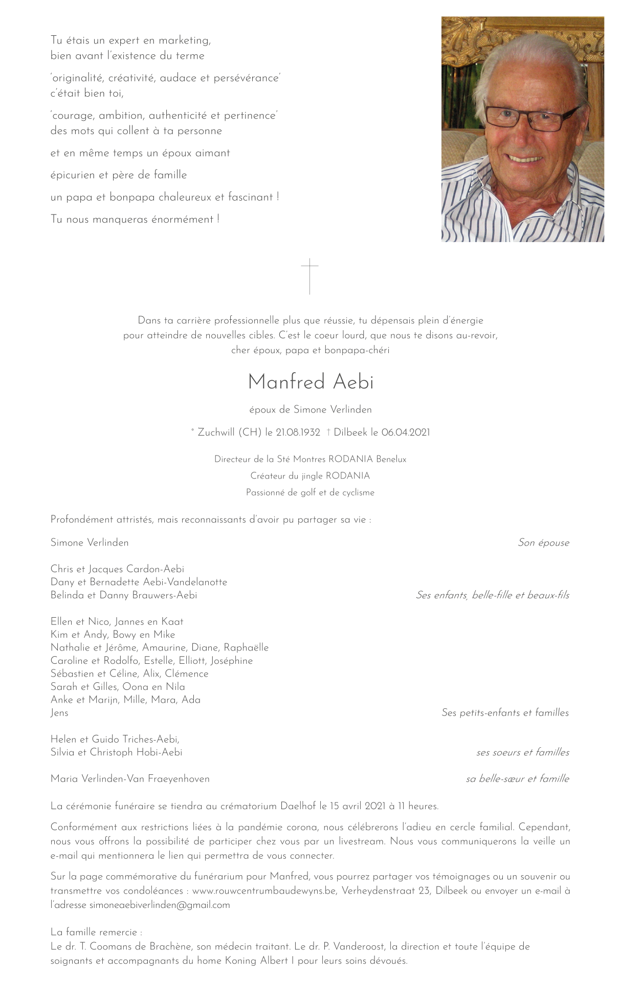 Décédé à Dilbeek (1700) le mardi 6 avril 2021 à l'âge de 88 ans
