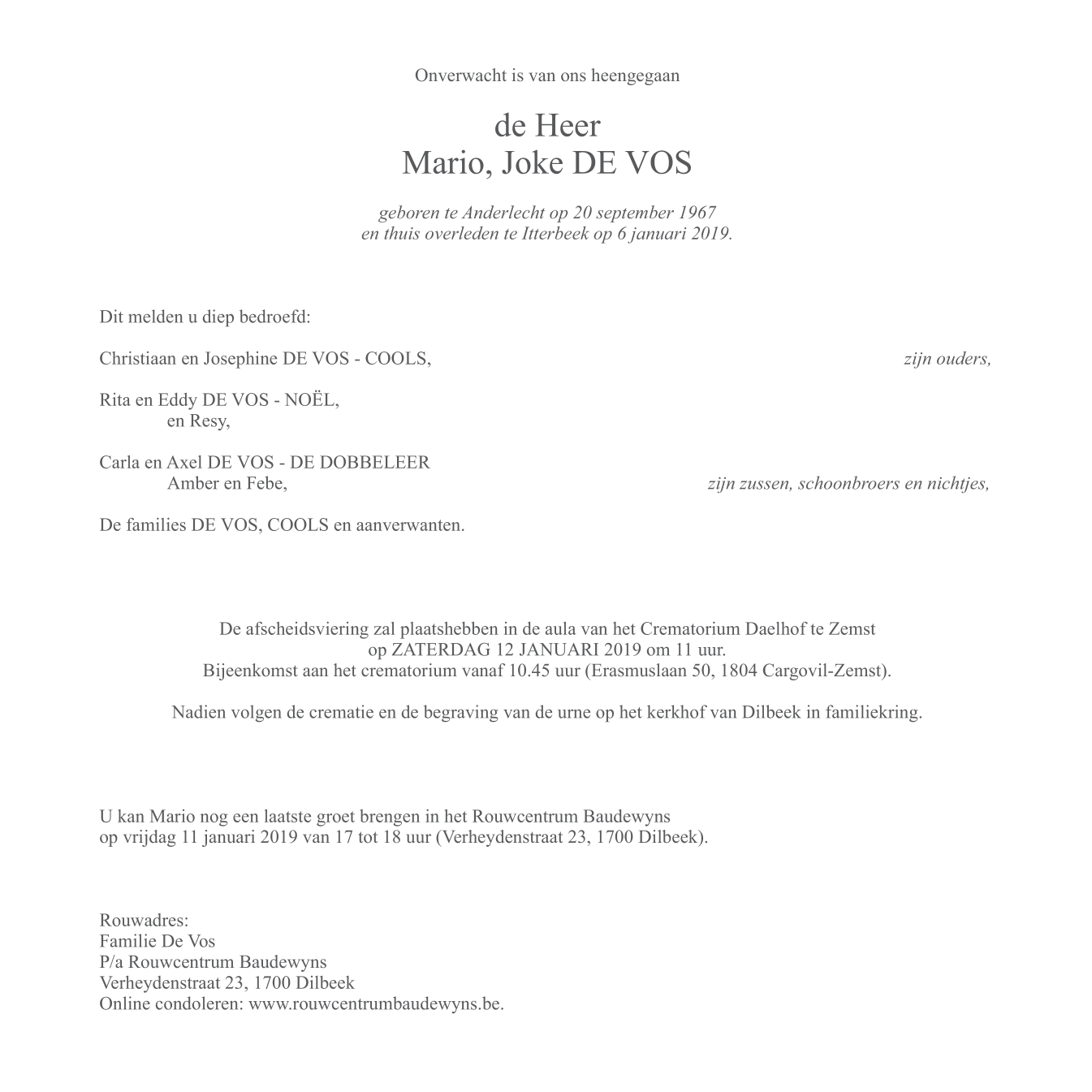 Décédé à Itterbeek (1701) le dimanche 6 janvier 2019 à l'âge de 51 ans