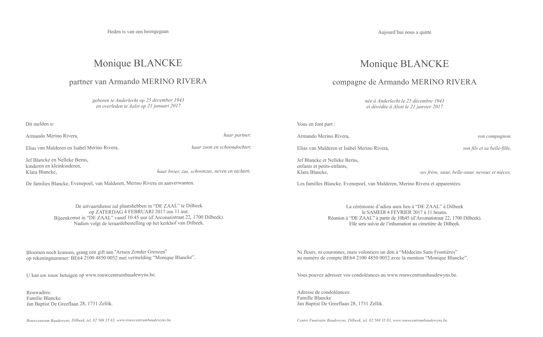 Décédée à Aalst (9300) le samedi 21 janvier 2017 à l'âge de 73 ans