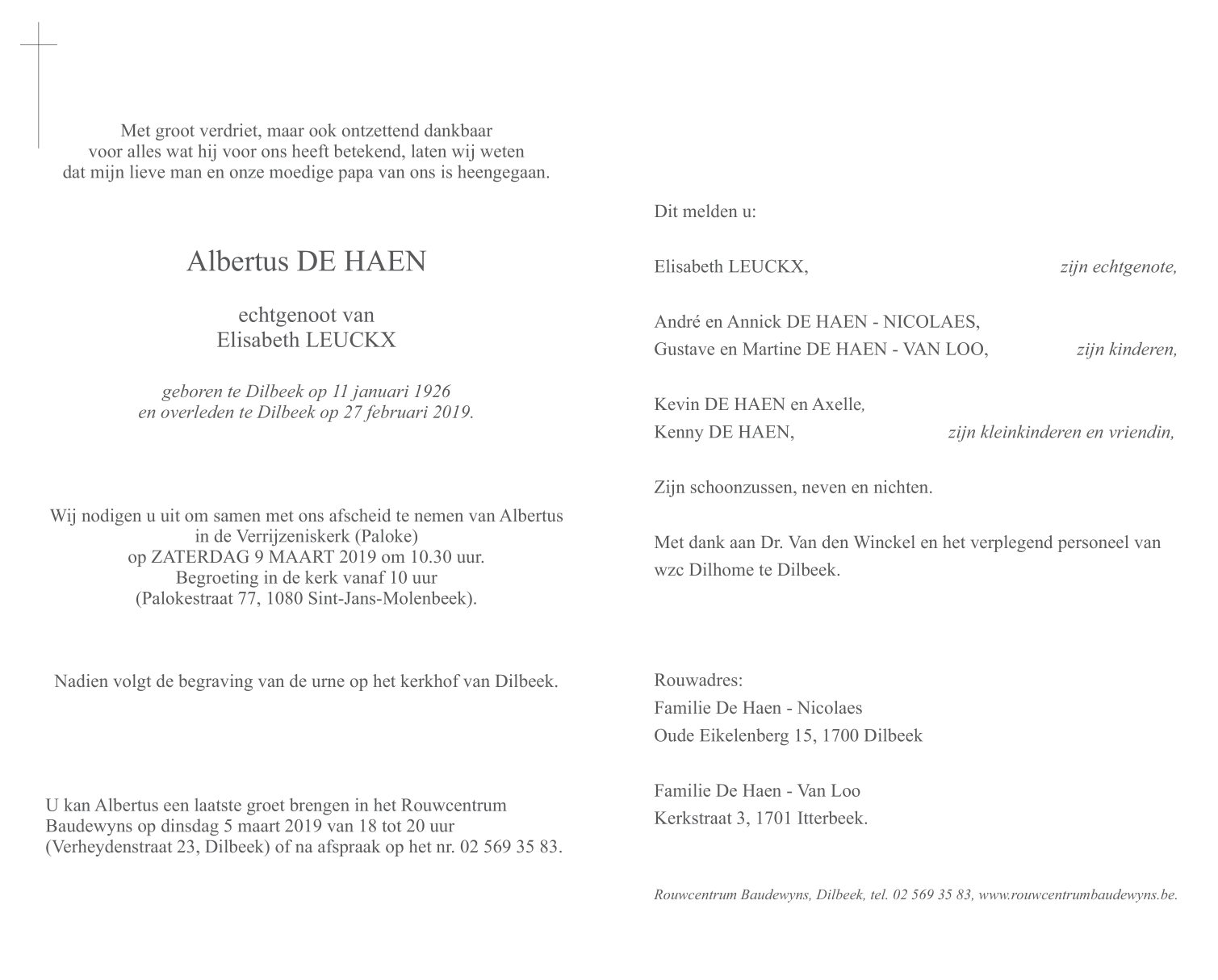 Décédé à Dilbeek (1700) le mercredi 27 février 2019 à l'âge de 93 ans