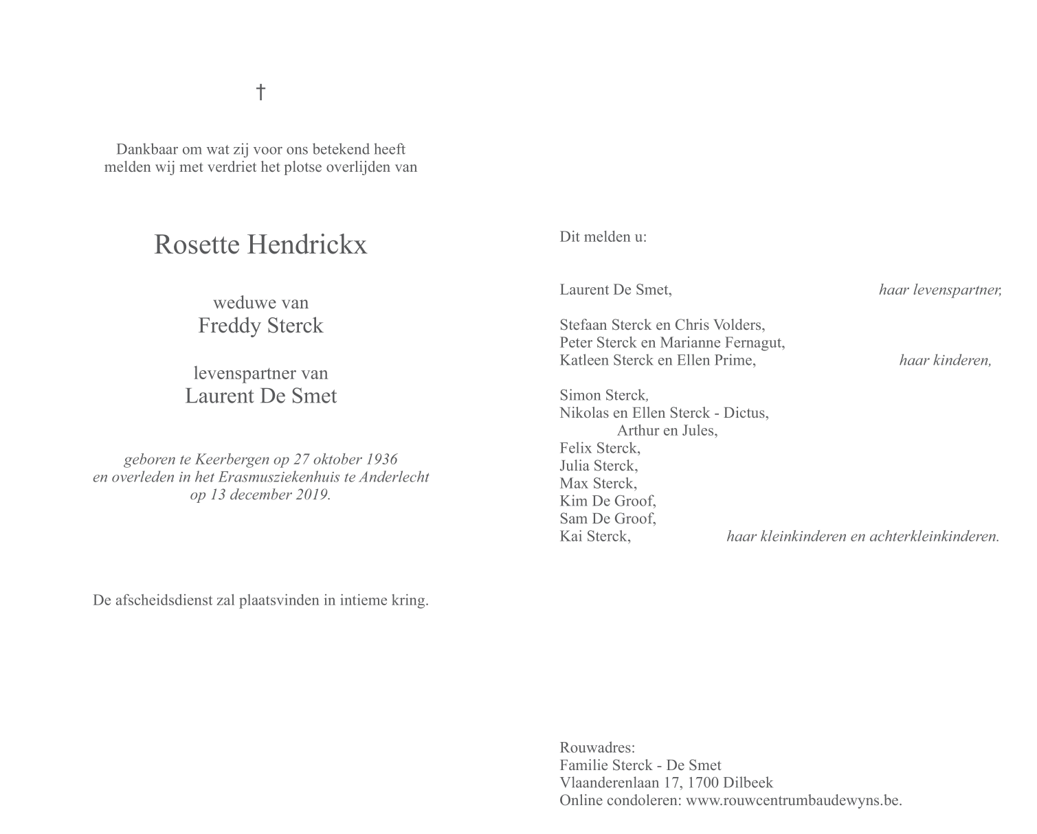 Décédée à Dilbeek (1700) le vendredi 13 décembre 2019 à l'âge de 83 ans