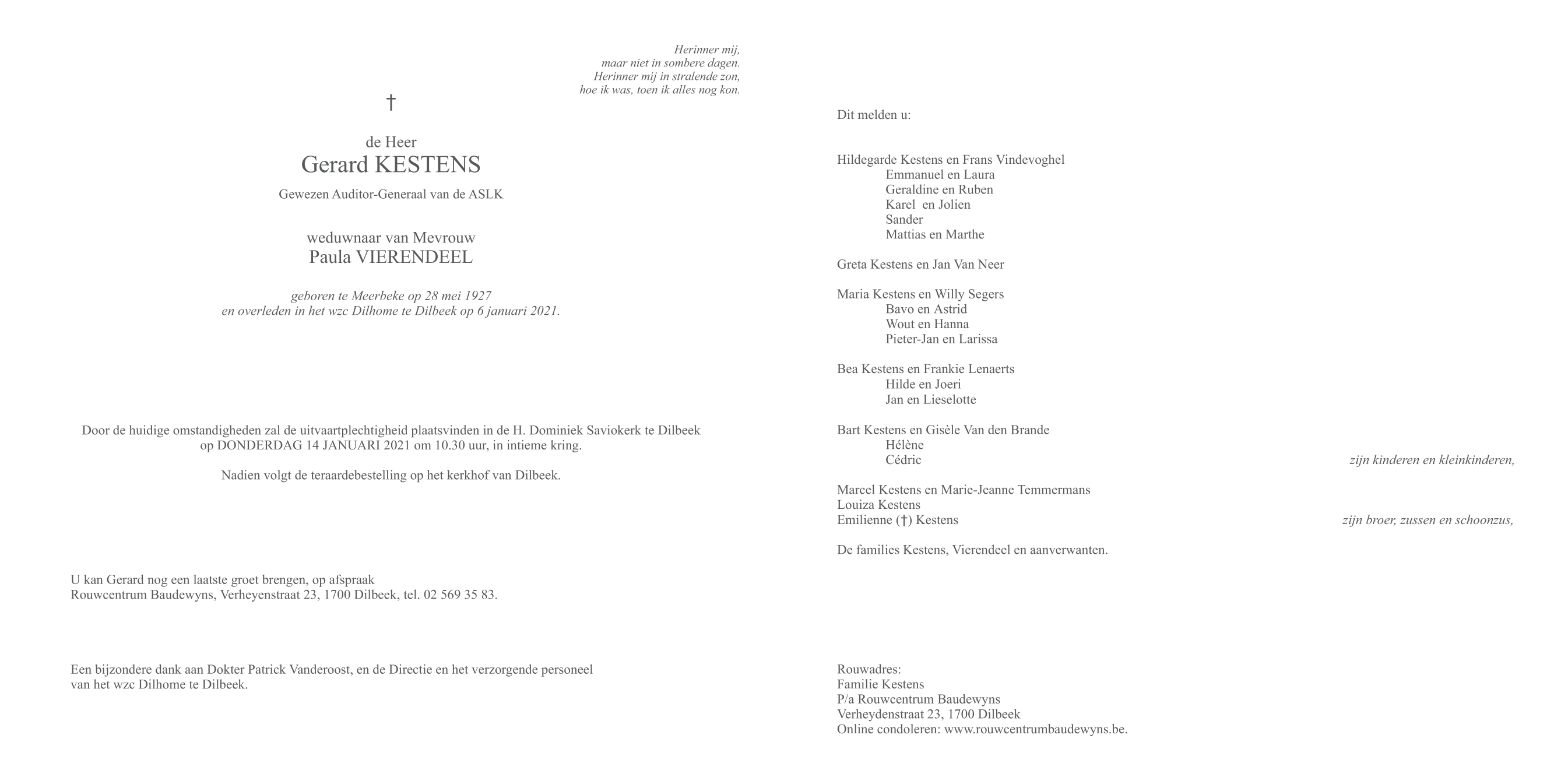 Décédé à Dilbeek (1700) le mercredi 6 janvier 2021 à l'âge de 93 ans