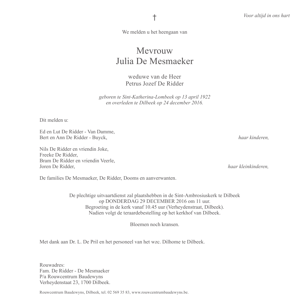 Décédée à Dilbeek (1700) le samedi 24 décembre 2016 à l'âge de 94 ans