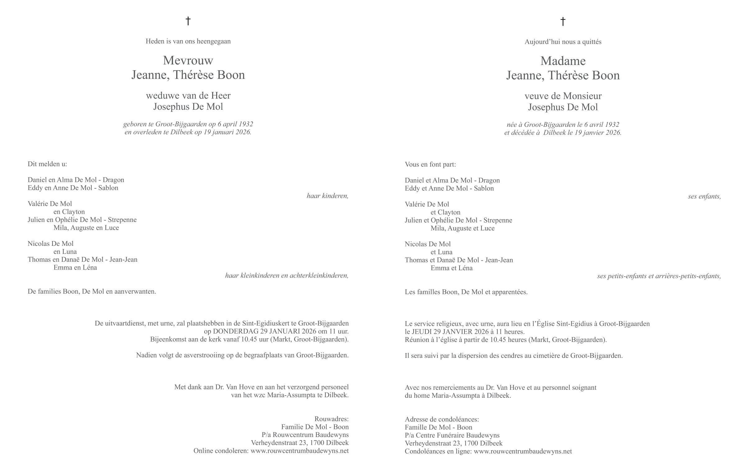 Décédée à Dilbeek (1700) le lundi 19 janvier 2026 à l'âge de 93 ans