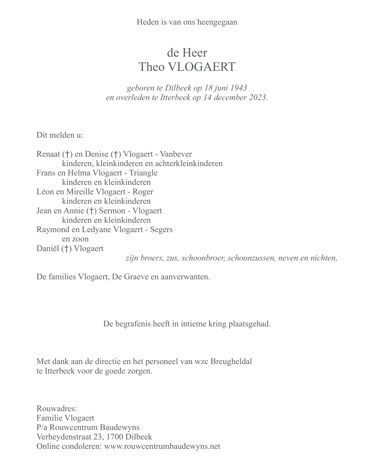Décédé à Itterbeek (1701) le jeudi 14 décembre 2023 à l'âge de 80 ans