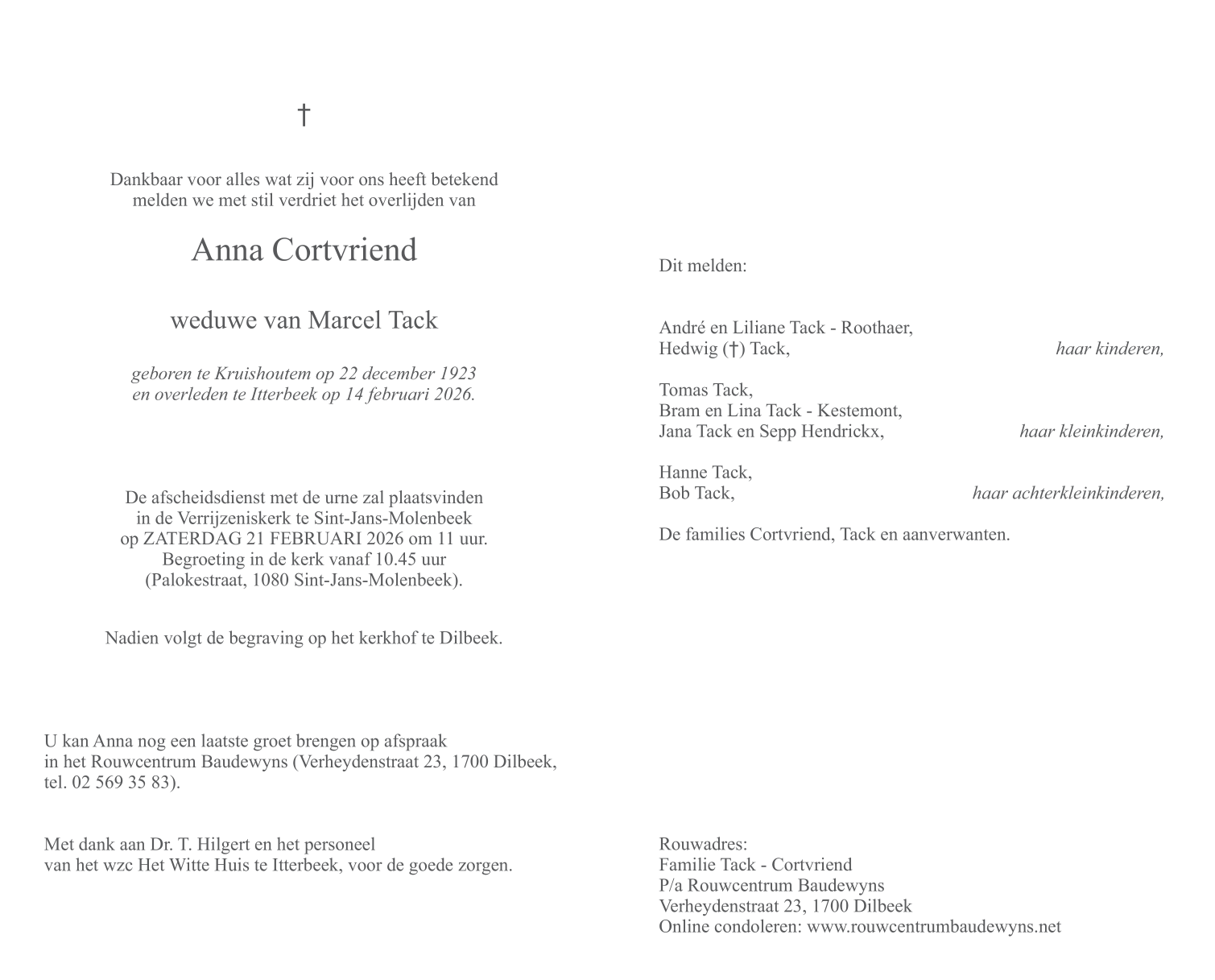 Décédée à Itterbeek (1701) le samedi 14 février 2026 à l'âge de 102 ans
