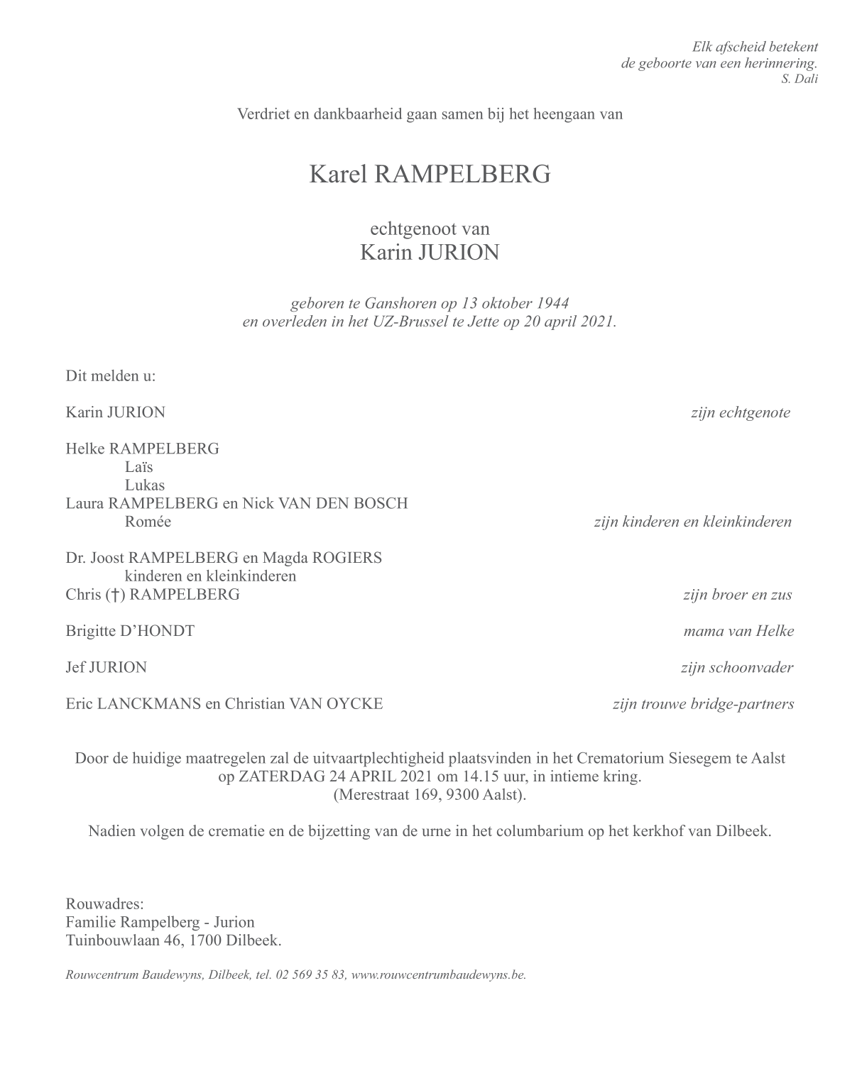 Décédé à Jette (1090) le mardi 20 avril 2021 à l'âge de 76 ans