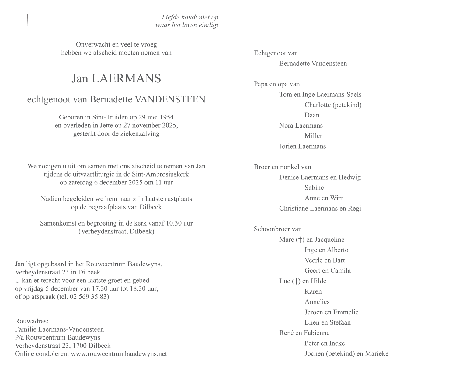 Décédé à Jette (1090) le jeudi 27 novembre 2025 à l'âge de 71 ans