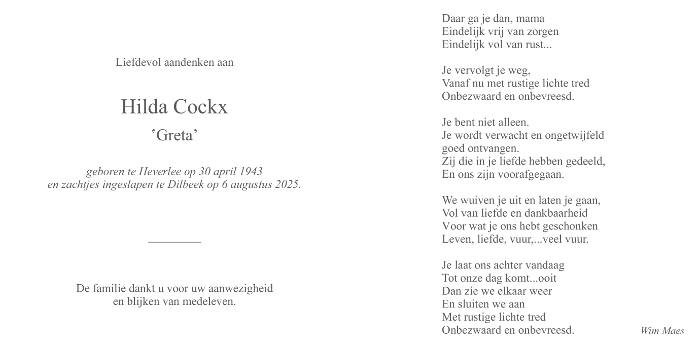 Décédée à Dilbeek (1700) le mercredi 6 août 2025 à l'âge de 82 ans