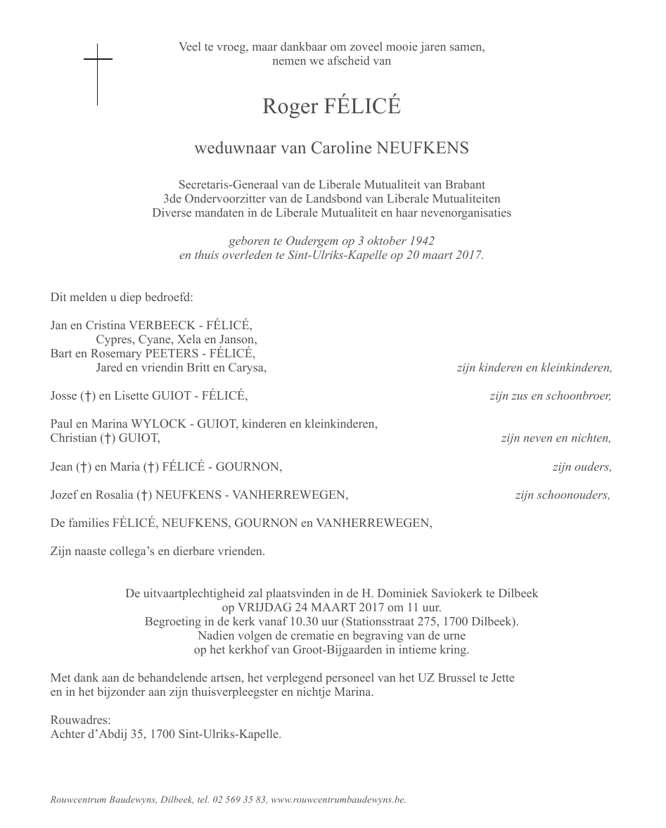 Décédé à Sint-Ulriks-Kapelle (1700) le lundi 20 mars 2017 à l'âge de 74 ans