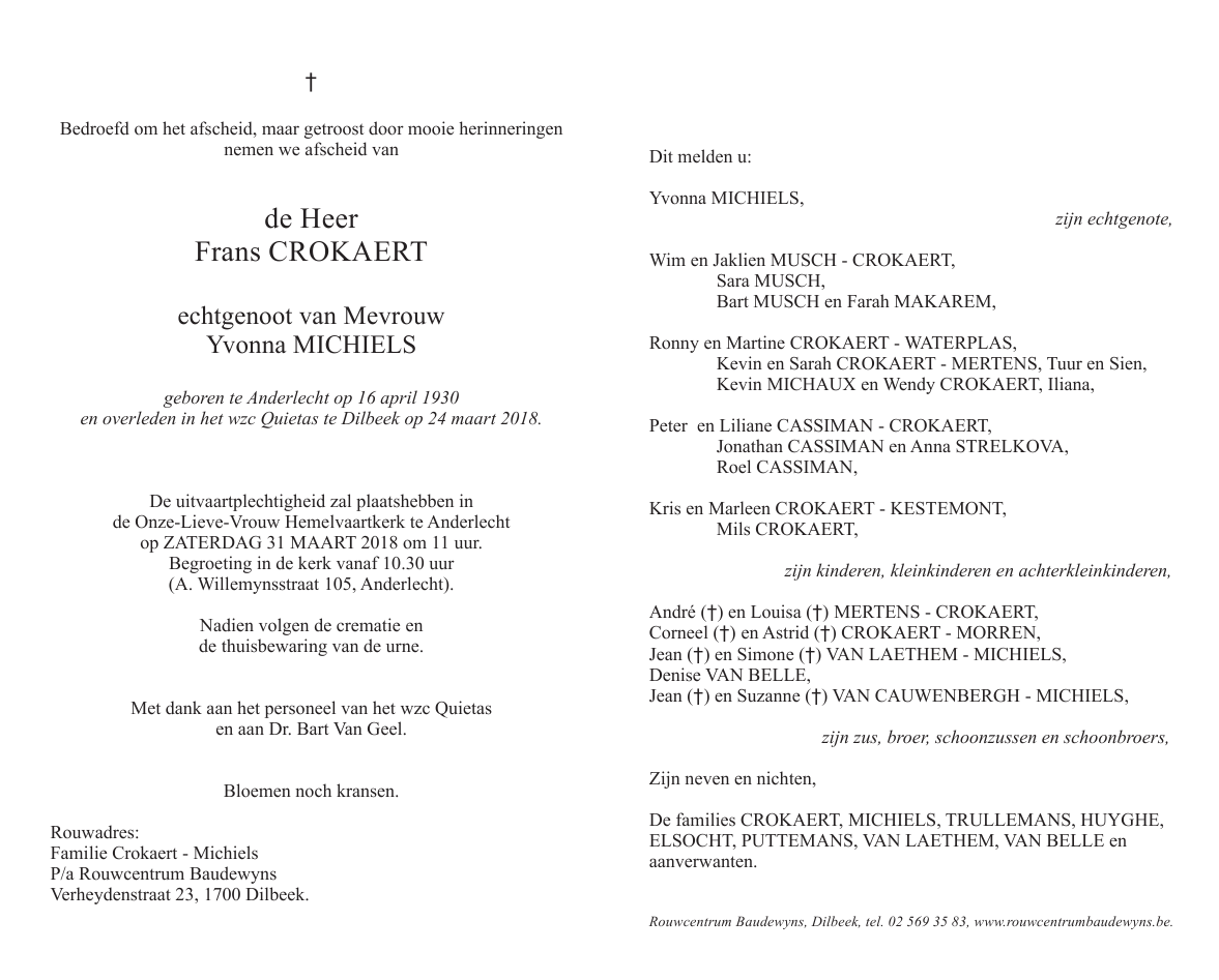 Décédé à Dilbeek (1700) le samedi 24 mars 2018 à l'âge de 87 ans