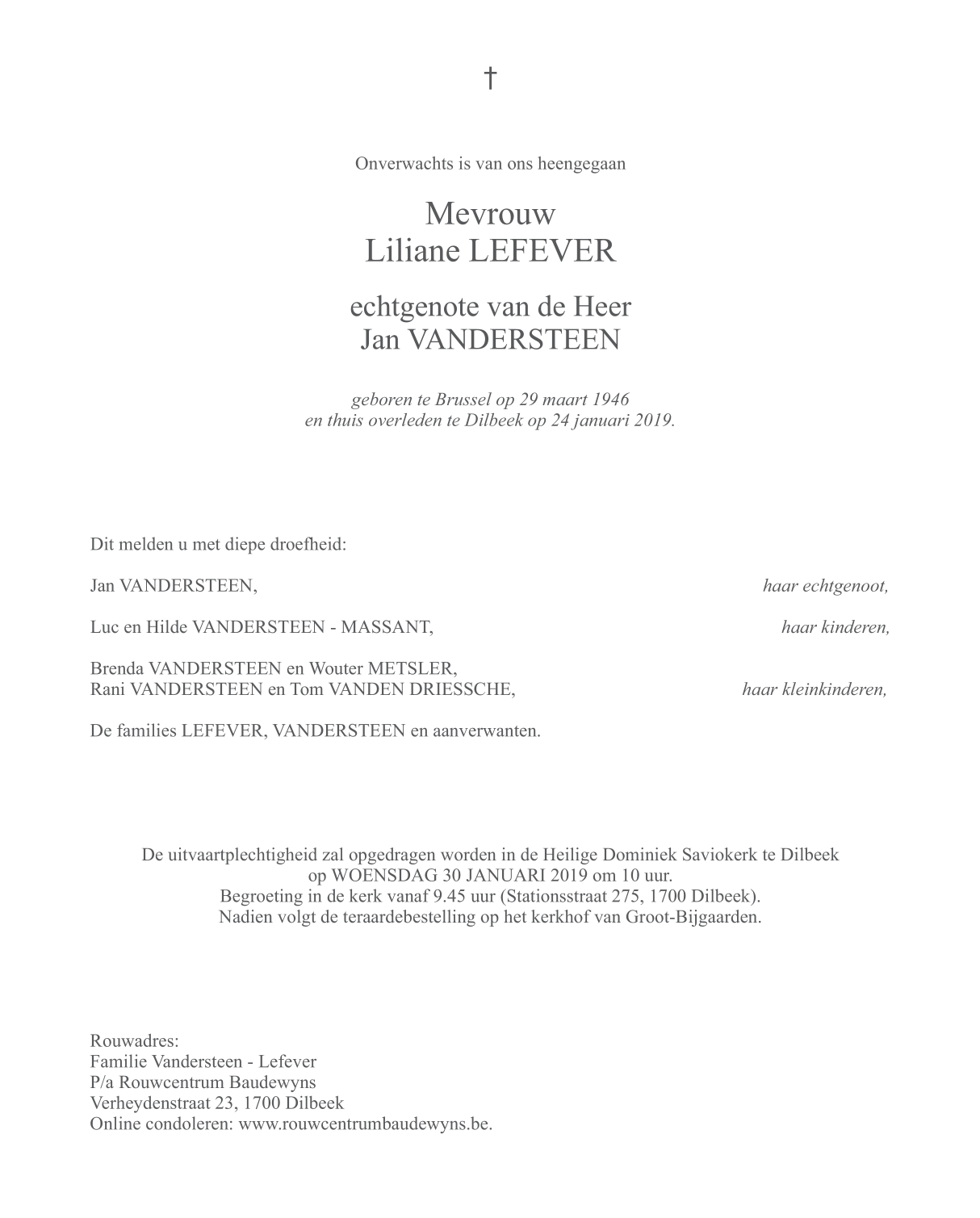 Décédée à Dilbeek (1700) le jeudi 24 janvier 2019 à l'âge de 72 ans