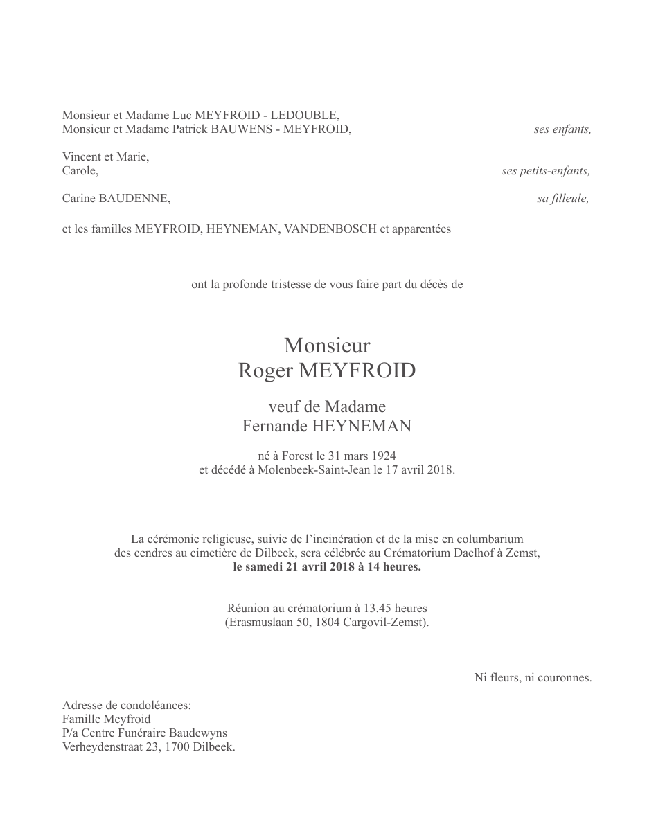 Décédé à Molenbeek-Saint-Jean (1080) le mardi 17 avril 2018 à l'âge de 94 ans