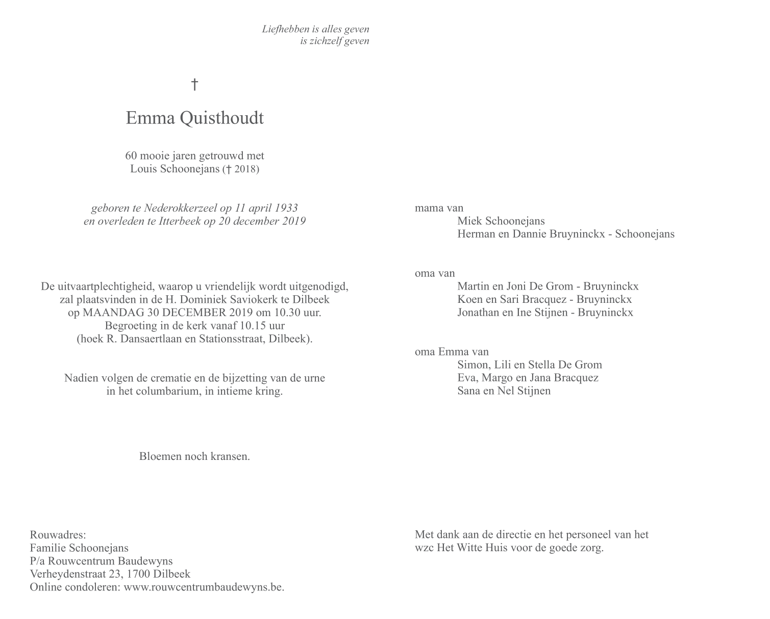 Décédée à Itterbeek (1701) le vendredi 20 décembre 2019 à l'âge de 86 ans