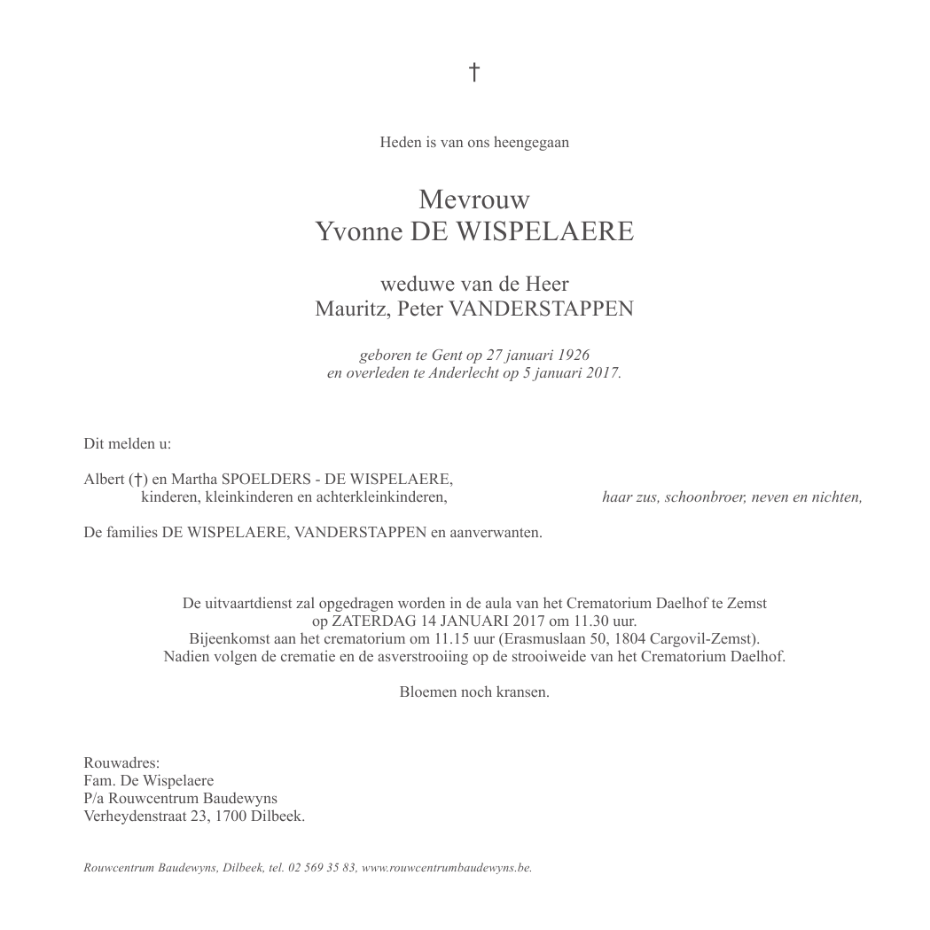 Décédée à Anderlecht (1070) le jeudi 5 janvier 2017 à l'âge de 90 ans