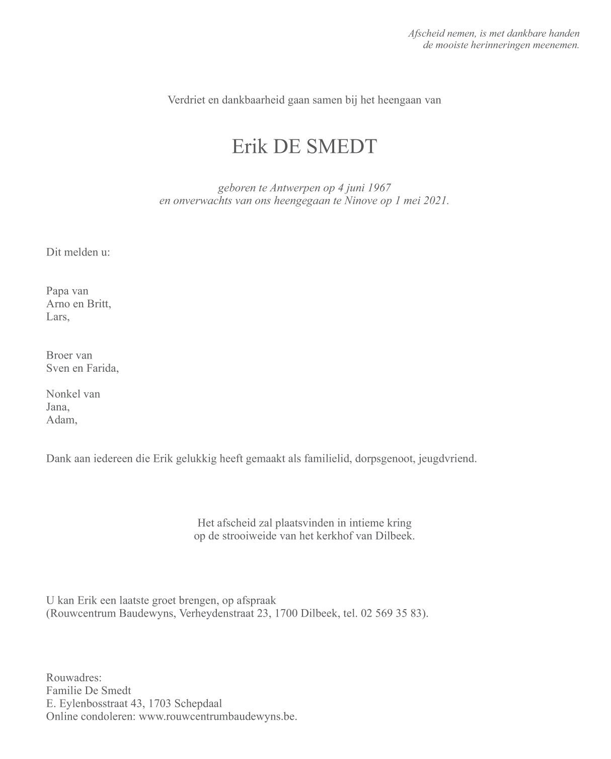 Décédé à Ninove (9400) le samedi 1 mai 2021 à l'âge de 53 ans