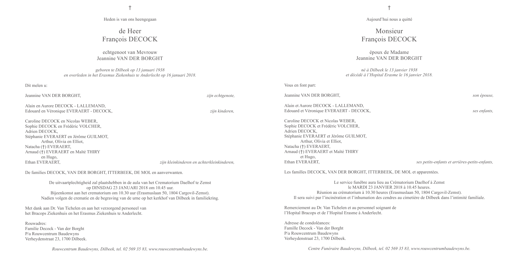 Décédé à Anderlecht (1070) le mardi 16 janvier 2018 à l'âge de 80 ans