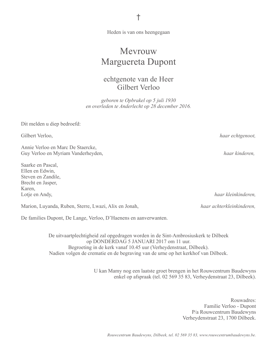 Décédée à Anderlecht (1070) le mercredi 28 décembre 2016 à l'âge de 86 ans