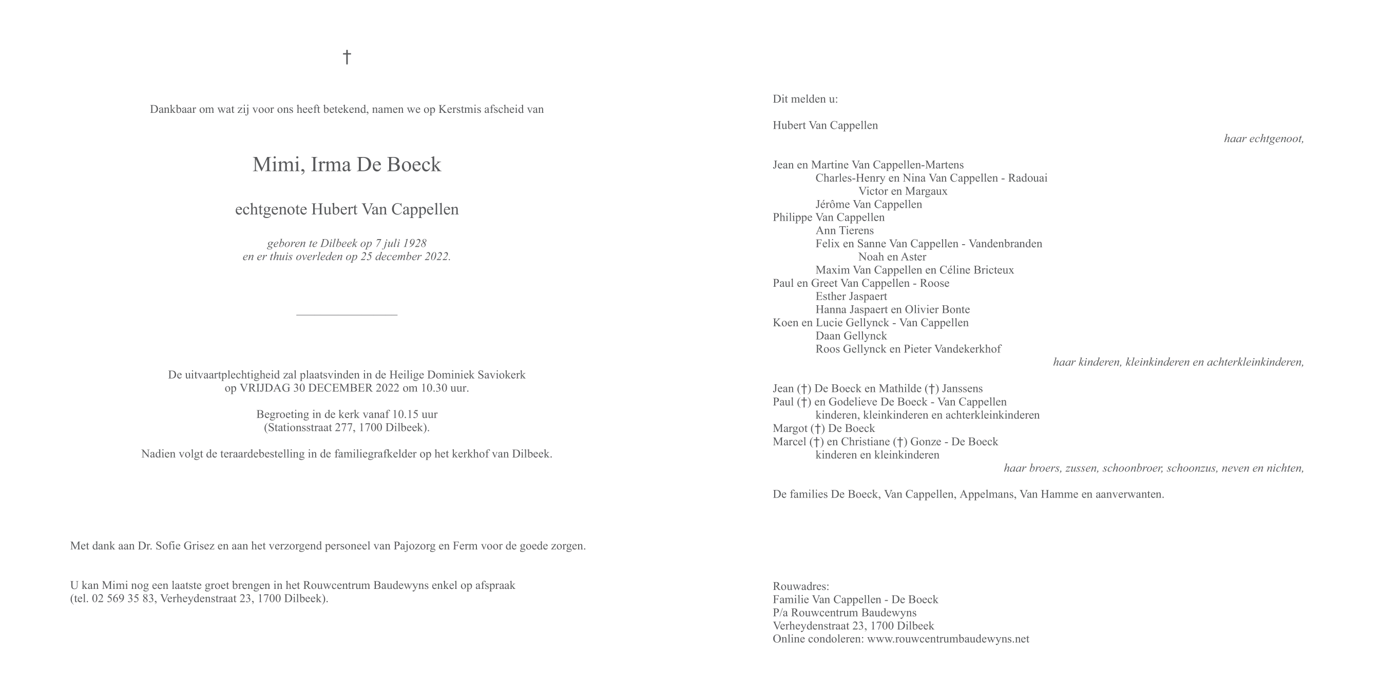 Décédée à Dilbeek (1700) le dimanche 25 décembre 2022 à l'âge de 94 ans