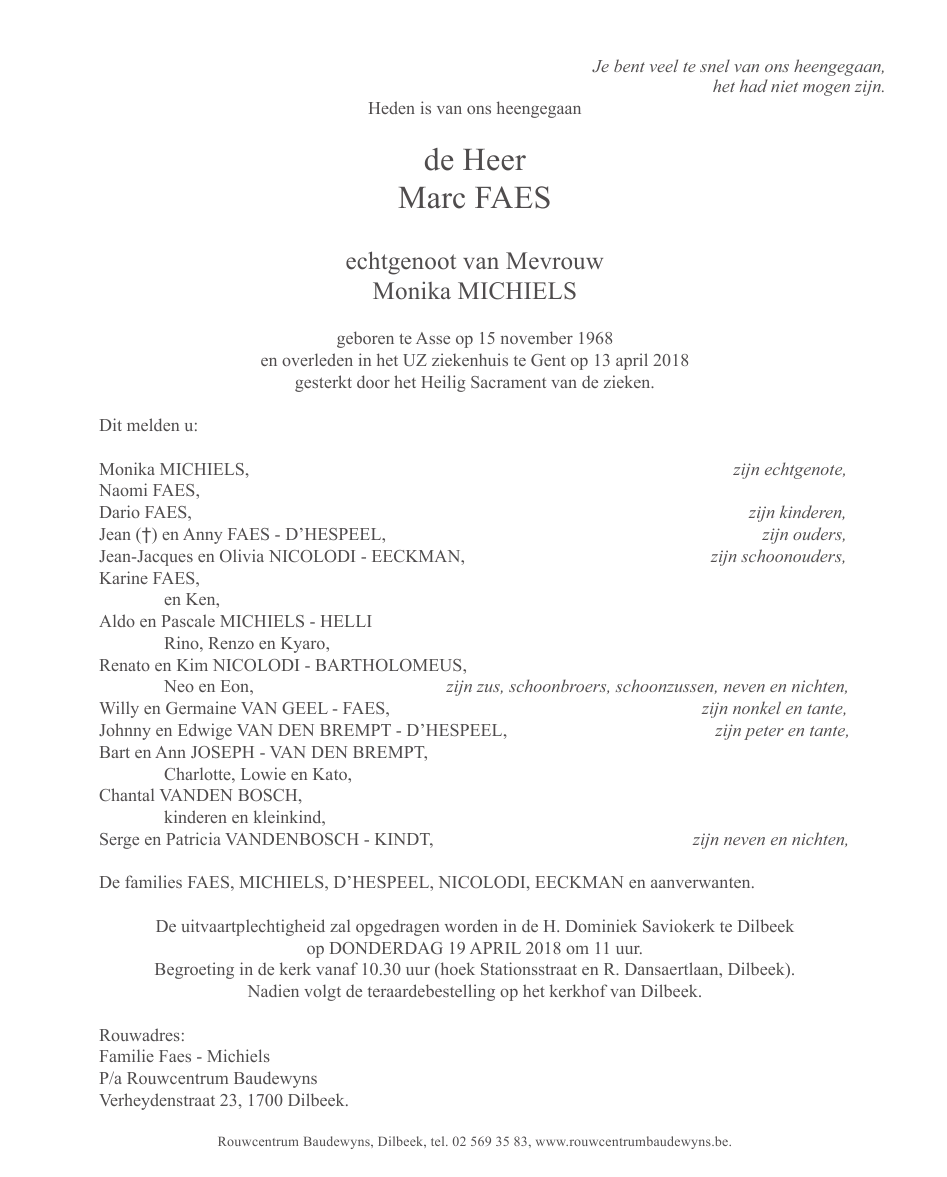 Décédé à Gent (9000) le vendredi 13 avril 2018 à l'âge de 49 ans