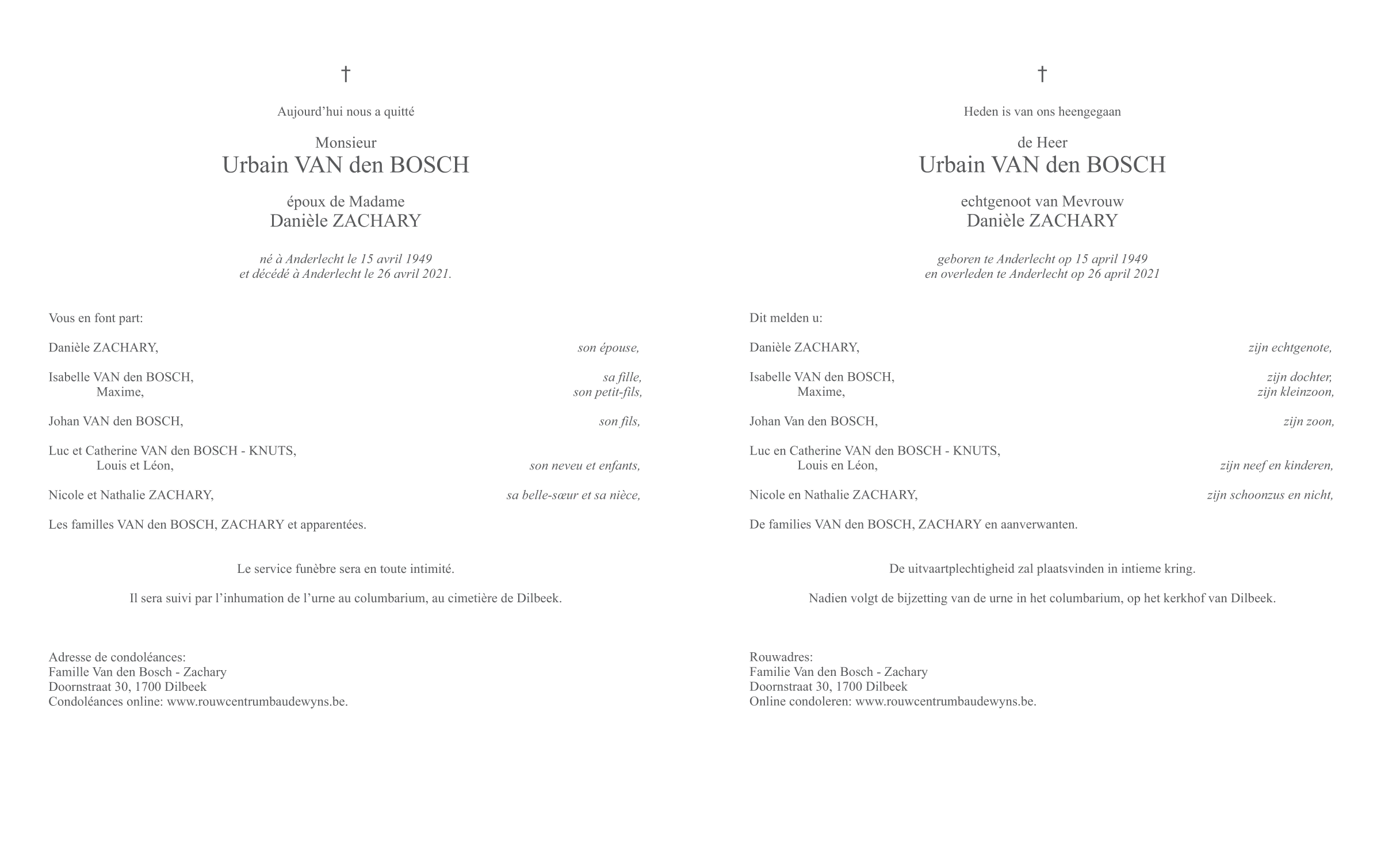 Décédé à Anderlecht (1070) le lundi 26 avril 2021 à l'âge de 72 ans