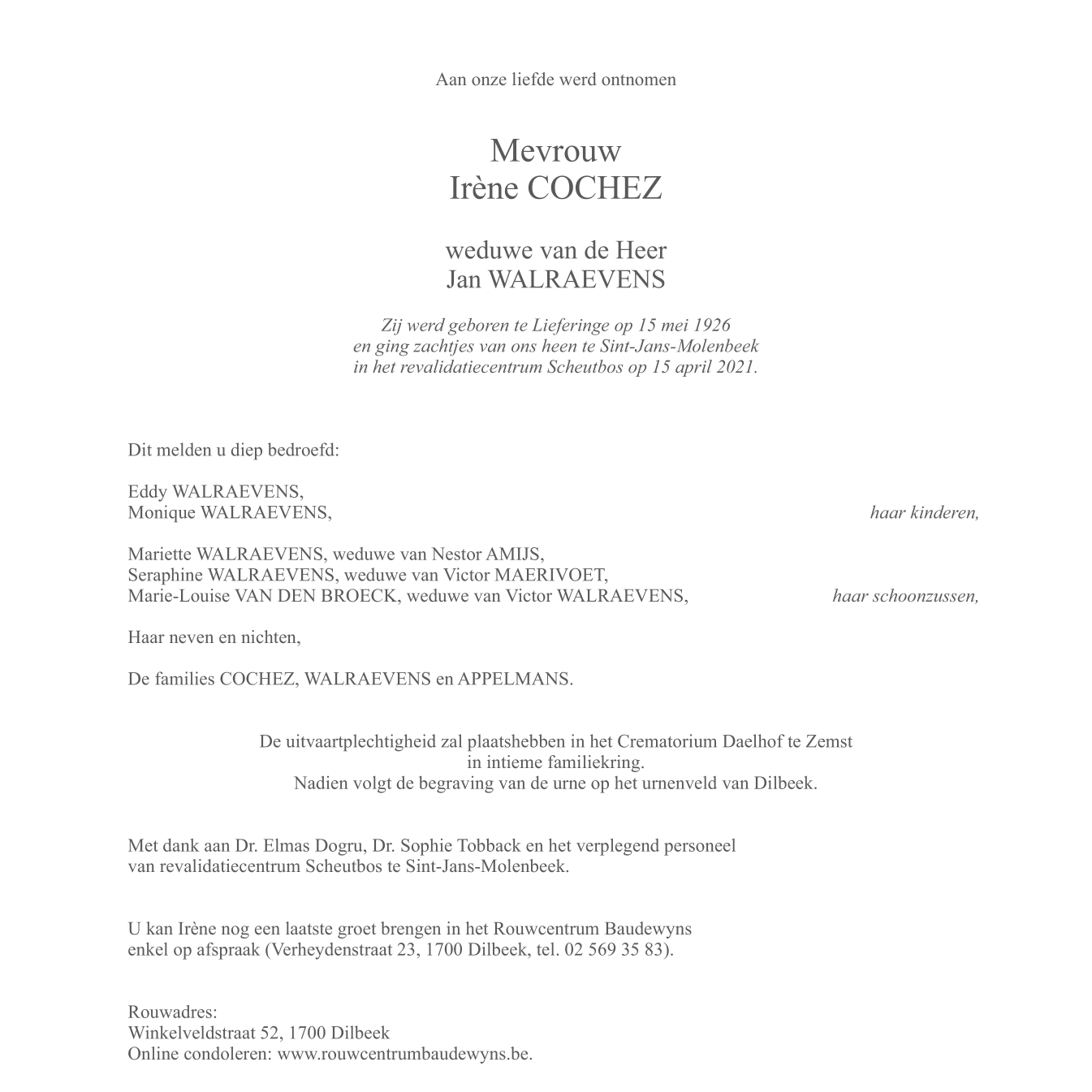 Décédée à Sint-Jans-Molenbeek (1080) le jeudi 15 avril 2021 à l'âge de 94 ans