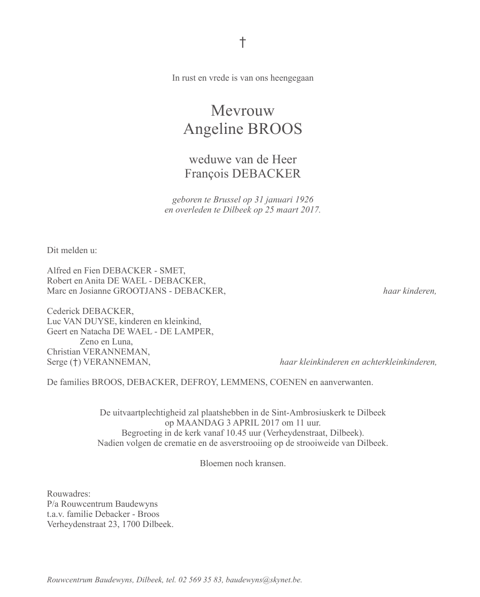 Décédée à Dilbeek (1700) le samedi 25 mars 2017 à l'âge de 91 ans